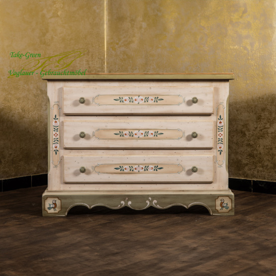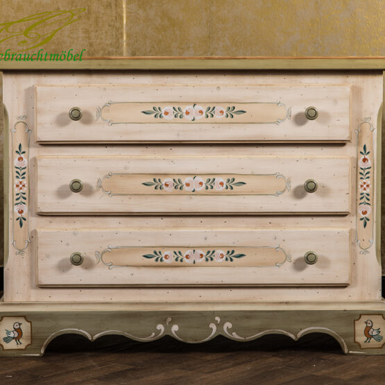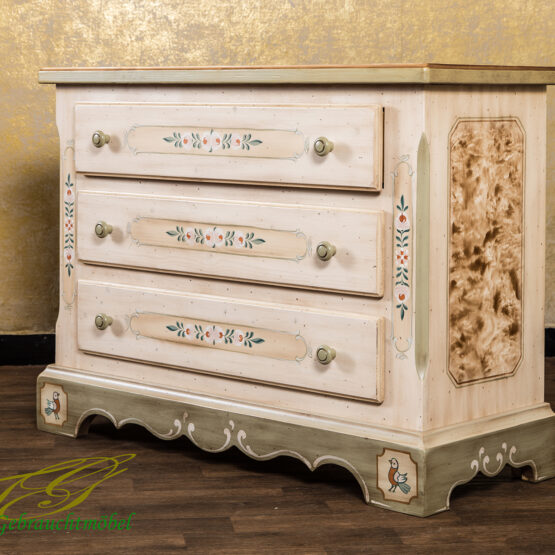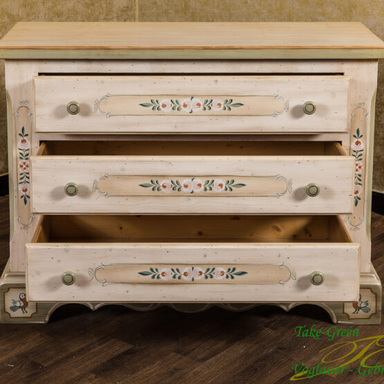 Drei geräumige Schubladen bieten reichlich Platz für Kleidung, Wäsche oder Alltagsgegenstände. Dank ihres klassischen Designs lässt sich die Kommode vielseitig einsetzen – ob im Schlafzimmer, Flur oder Wohnbereich. Ein Möbelstück, das Stauraum mit alpenländischer Gemütlichkeit verbindet und in jedem Zuhause einen besonderen Akzent setzt.