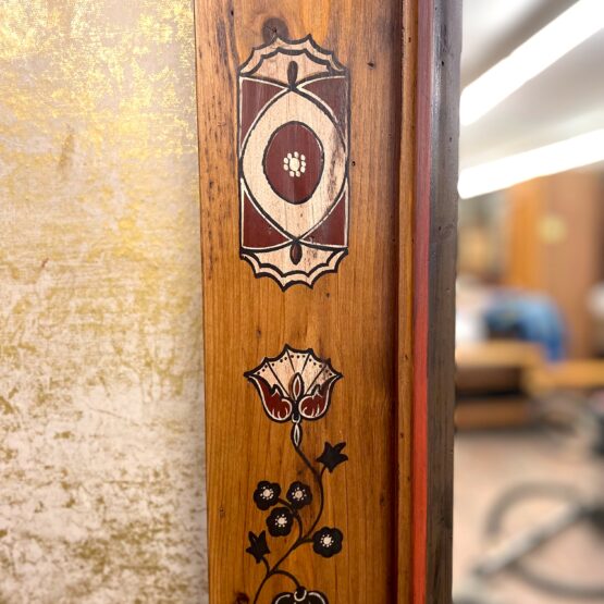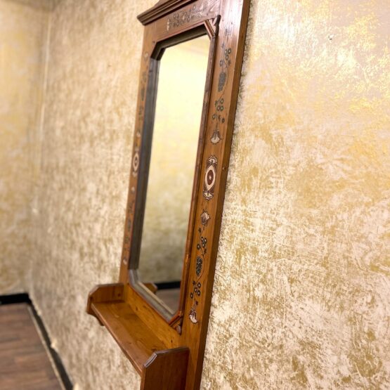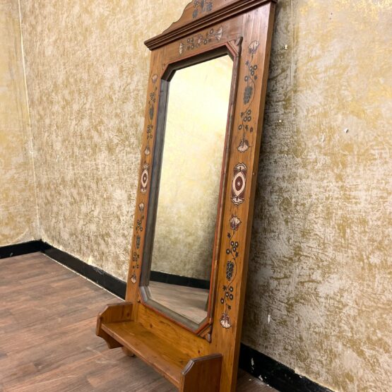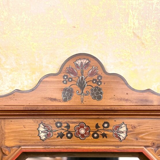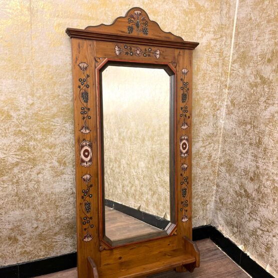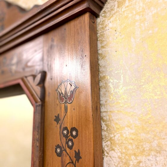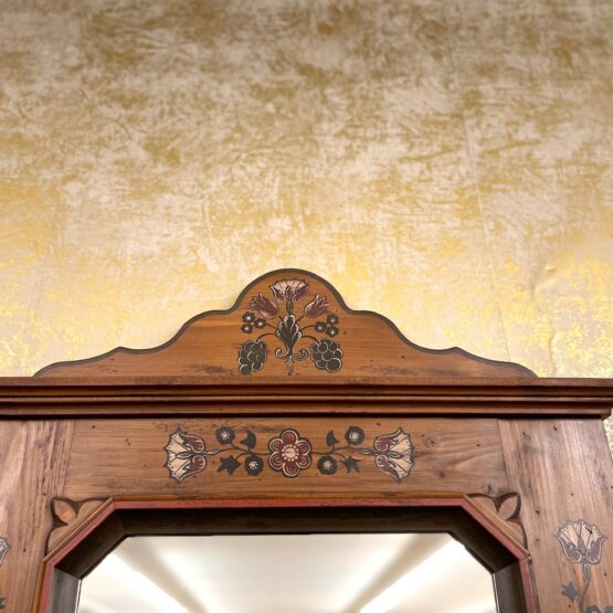 Der handbemalte Rahmen aus massivem Holz erzählt von echter Handwerkskunst und feinem Gespür für Details. Zarte Blumenranken und Ornamente schmücken die seitlichen Leisten sowie den geschwungenen Giebel und verleihen dem Spiegel eine warme, einladende Ausstrahlung.