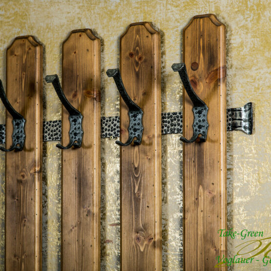 Die vier schmiedeeisernen Kleiderhaken an den Streben machen sie zu einem echten Blickfang in Ihrer Diele.