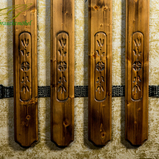 Diese vierstrebige Wandgarderobe aus rustikalem Fichtenholz gehört zur Serie „Anno 1600“ und besticht durch ihre kunstvollen Schnitzereien.