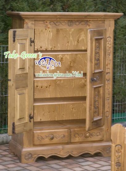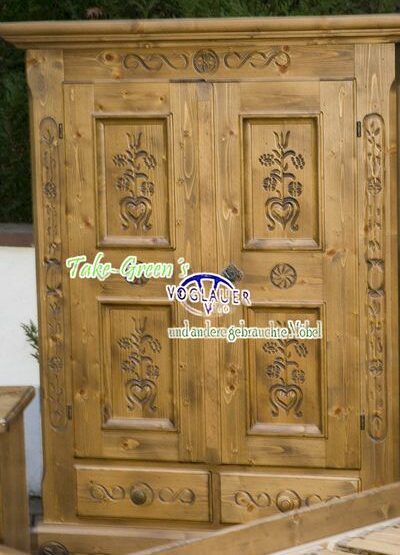Dieser wunderschöne Bauernschrank aus massivem Fichtenholz eignet sich hervorragend als Wäscheschrank.