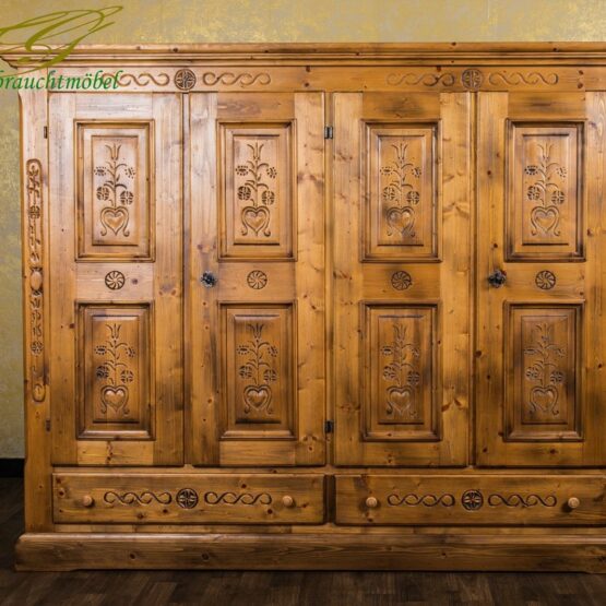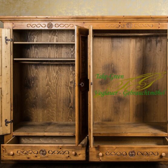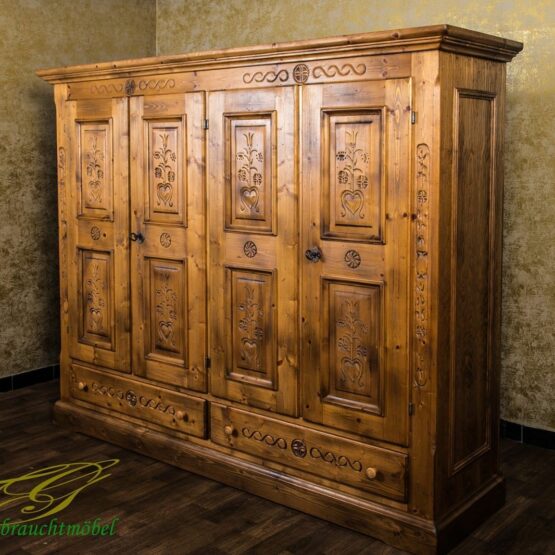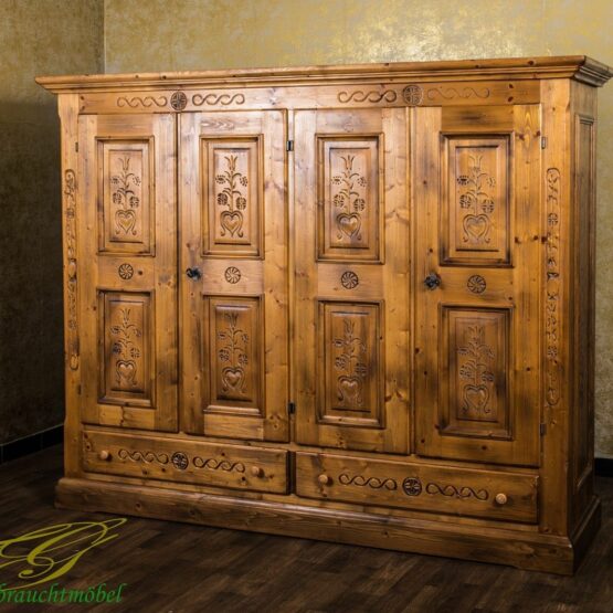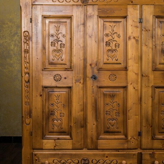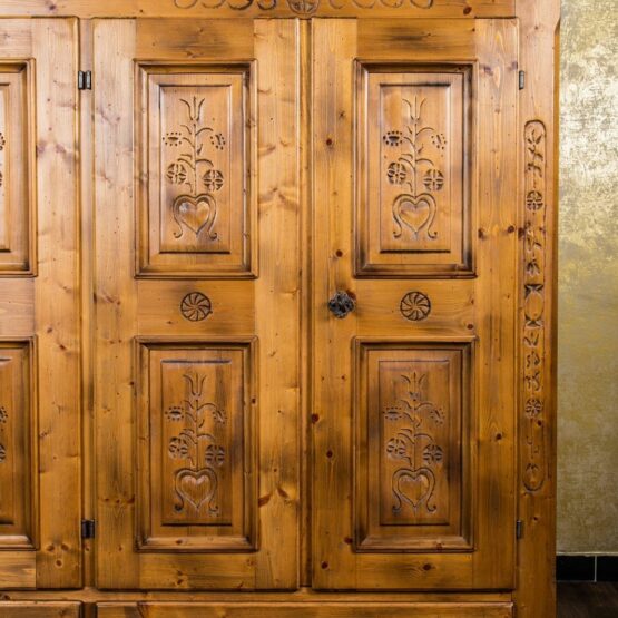 Die schönen Schnitzereien im massiven Holz verleihen dem Schrank eine rustikale Note und machen ihn zu einem echten Blickfang in jedem Raum.