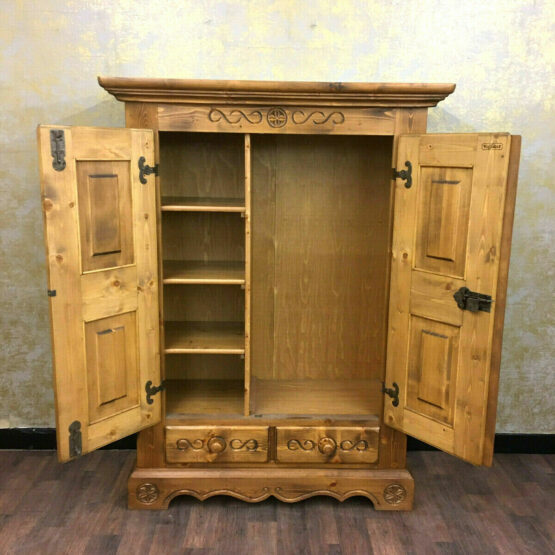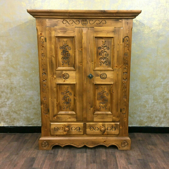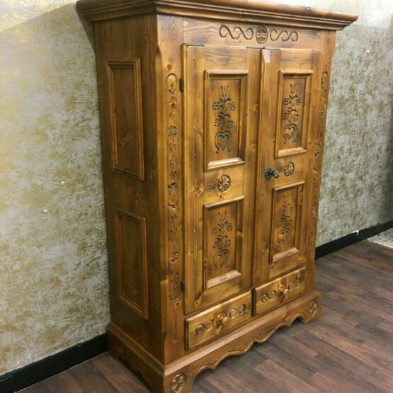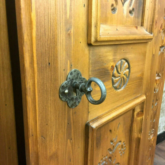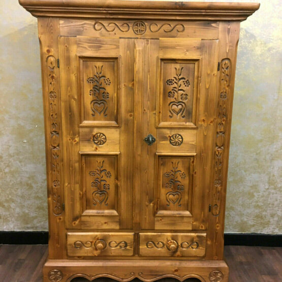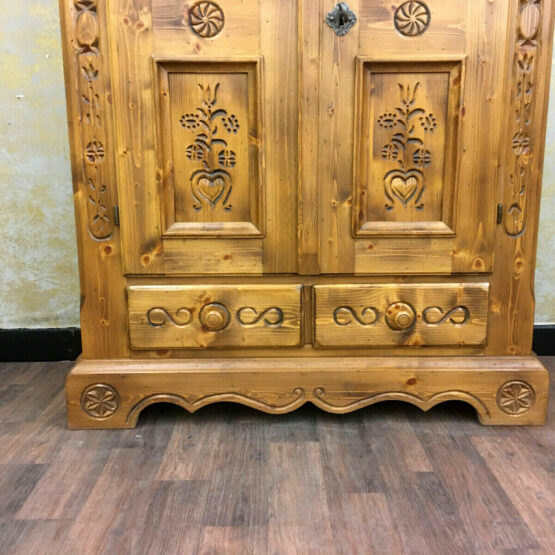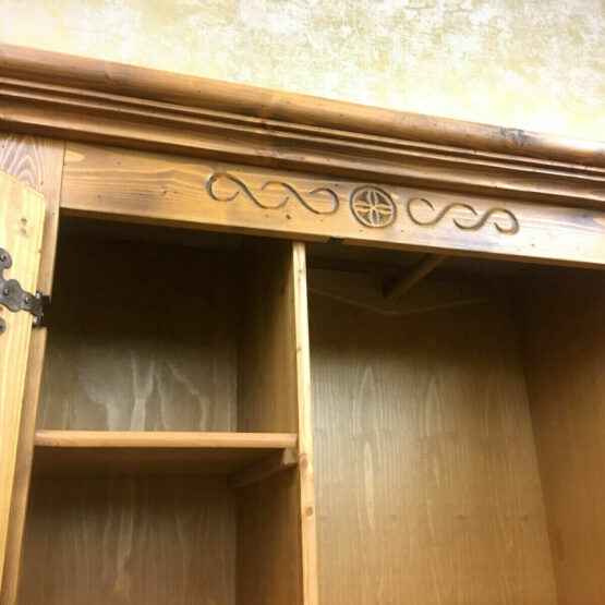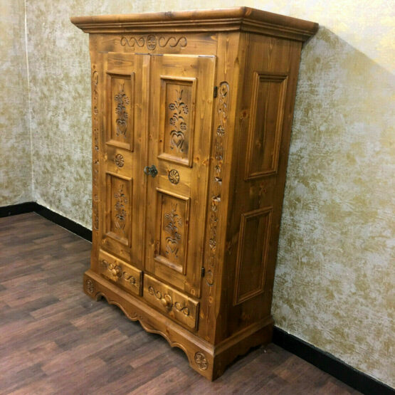 Das massive Fichtenholz wurde von Hand verziert und verströmt eine angenehme Wärme, die dem Schrank seinen rustikalen Charme verleiht.