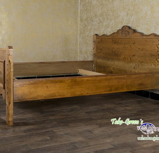 Hergestellt aus massivem Fichtenholz, besticht es durch seine schönen Maserungen und kunstvollen Verzierungen, die ihm eine individuelle Note verleihen. Im typischen Landhausstil fügt sich das Bett harmonisch in jedes Schlafzimmer ein.