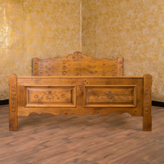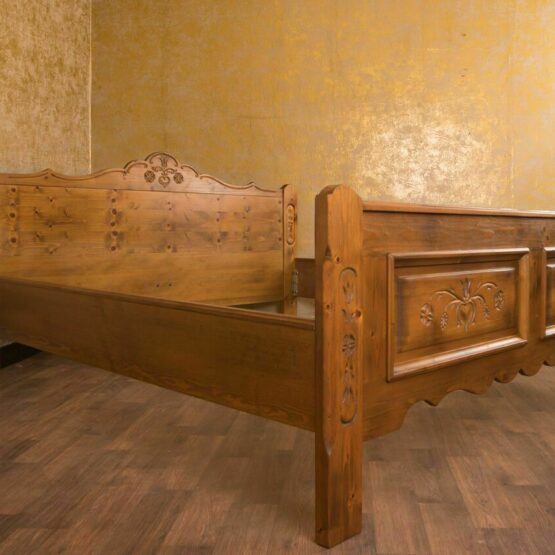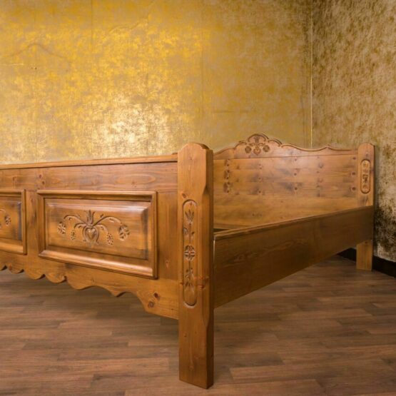 Das massive Holz ist mit wunderschönen Schnitzereien verziert, die dem Bett eine besondere, rustikale Note verleihen.