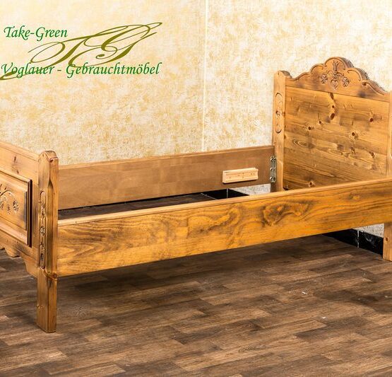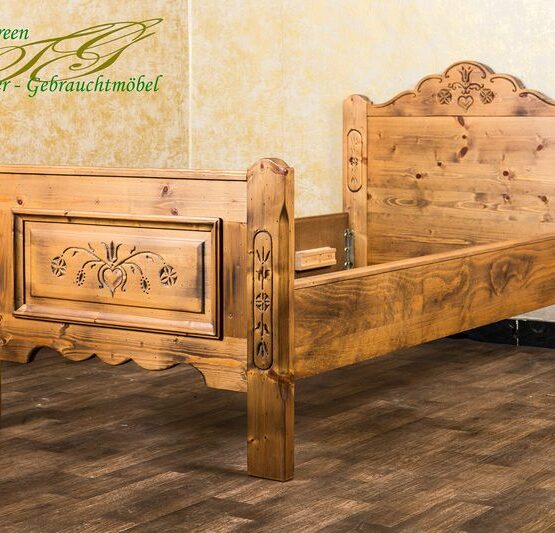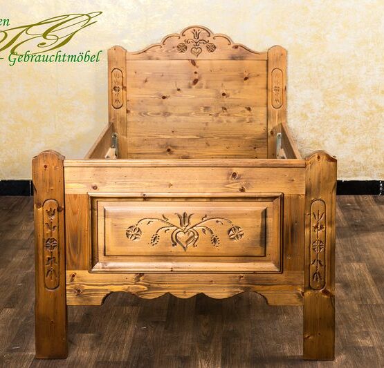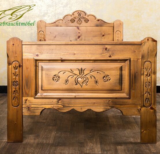 Die schönen Maserungen des Holzes kommen in Kombination mit kunstvollen Schnitzereien besonders zur Geltung und verleihen dem Bett eine warme, gemütliche Ausstrahlung.