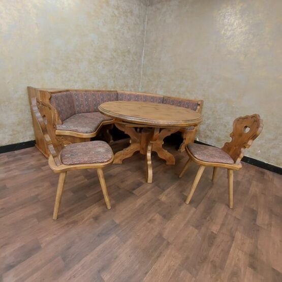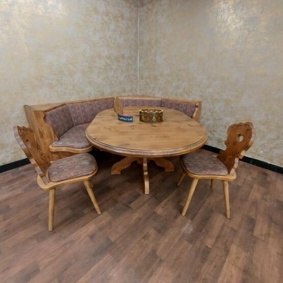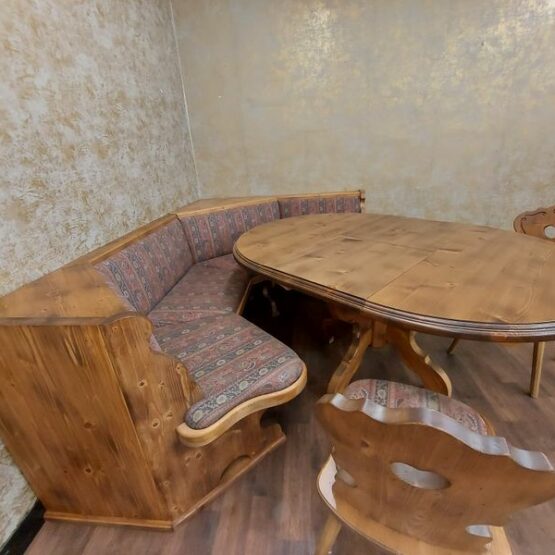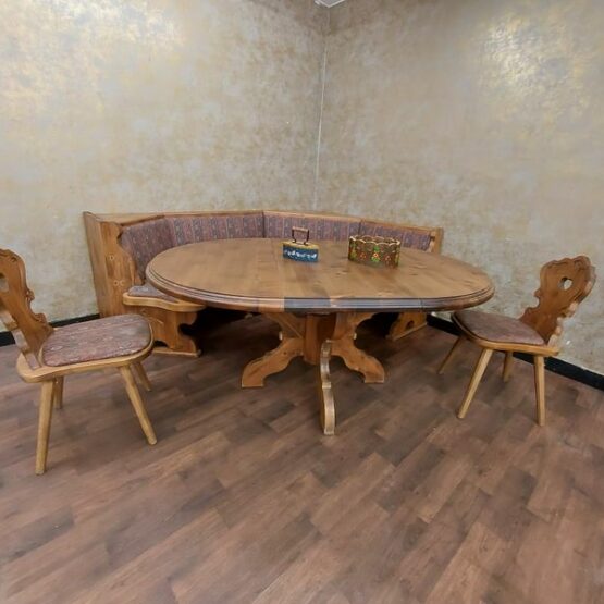 Diese hochwertige Essgarnitur von Voglauer besteht aus einem Esstisch, einer Eckbank und zwei Stühlen – perfekt für gemeinsame Stunden im Familien- oder Freundeskreis.
