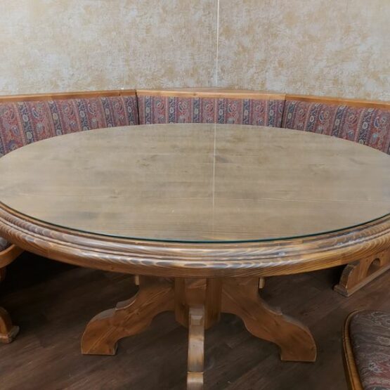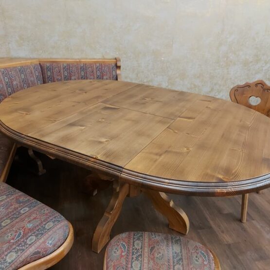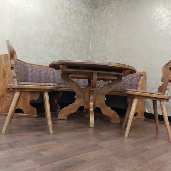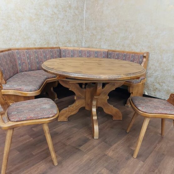In rustikaler Optik gehalten, strahlt die Garnitur eine warme und einladende Atmosphäre aus, die ideal für gemütliche Mahlzeiten und entspannte Abende ist.
