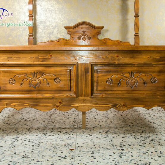 Massives Holz in warmem Antikton, kunstvolle Schnitzmotive mit Herz- und Blumenornamenten sowie die aufwendig gedrechselten Eckpfosten verleihen dem Bett eine herrschaftliche Ausstrahlung. Die geschwungenen Formen des Baldachins und das detailverliebte Kopfteil versprühen zeitlose Romantik und Geborgenheit.
