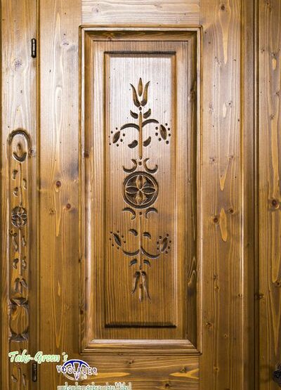 Er ist aus massivem Fichtenholz gefertigt und mit kunstvollen Schnitzereien verziert.