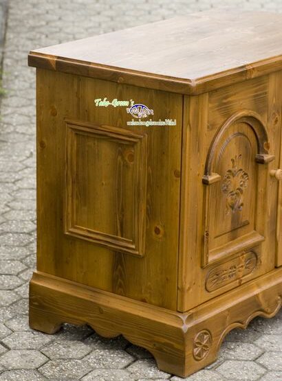 Es ist aus massivem Fichtenholz gefertigt, aufwendig verziert und bringt eine angenehme ländliche Note in Ihr Zuhause. Das klassische Design strahlt Wärme aus und verbreitet rustikalen Charme.