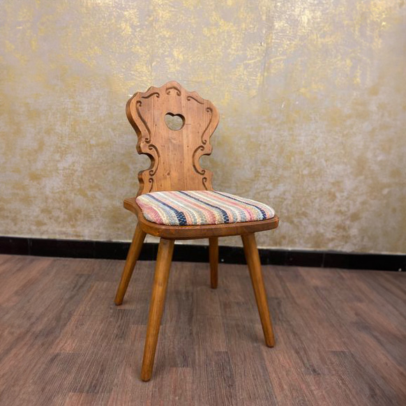 Das Herzmotiv in der Rückenlehne, zarte Schnitzereien und warme Holztöne erzählen von alpiner Handwerkskunst, wie man sie nur noch selten findet. Die gepolsterte Sitzfläche fügt sich harmonisch ins Gesamtbild ein und sorgt für spürbare Bequemlichkeit – ideal für lange Abende am Familientisch.
