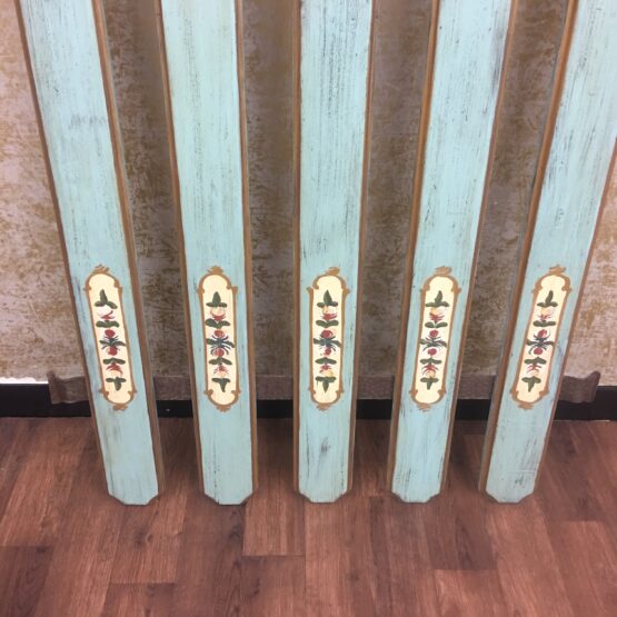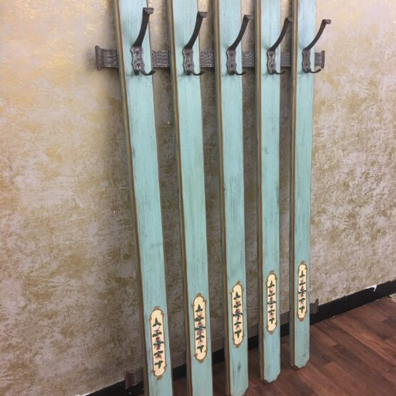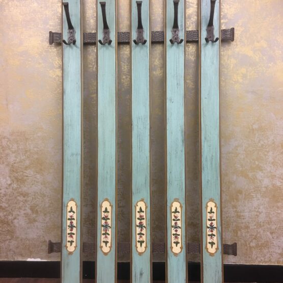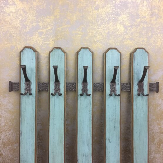 Die fünf schlanken Paneele in sanftem Altblau sind jeweils mit filigranen floralen Motiven verziert und bilden einen harmonischen Rahmen für die geschmiedeten Doppelhaken in dunklem Metall. Die handwerkliche Verarbeitung und die authentische Farbgebung verleihen diesem Stück einen Hauch von alpiner Gemütlichkeit.