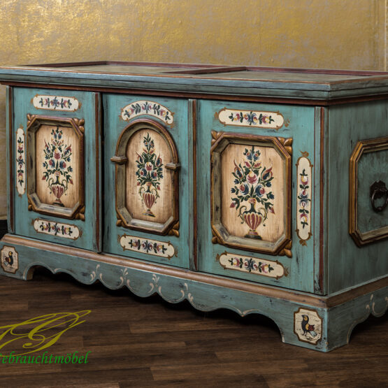 Das altblaue Möbelstück mit drei aufwendig verzierten Frontfeldern ist ein echtes Schmuckstück – nicht nur für Bauernstuben, sondern für jeden Raum, der ein Stück gelebter Tradition vertragen kann. Besonders der mittlere Bogenrahmen mit floraler Malerei zieht den Blick auf sich und verleiht dem Möbel eine fast sakrale Anmutung.