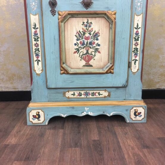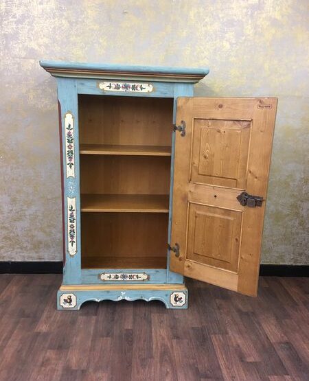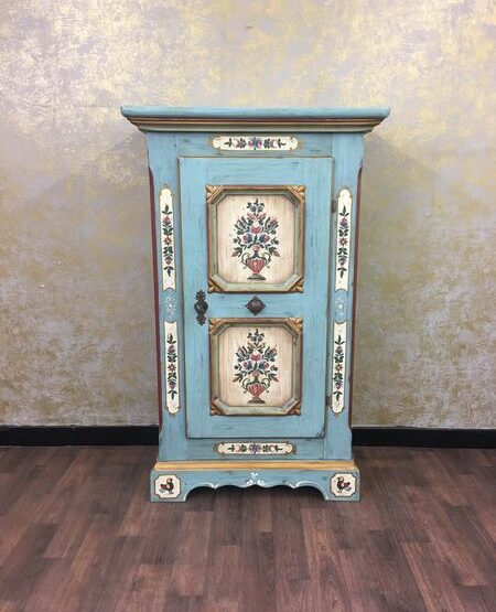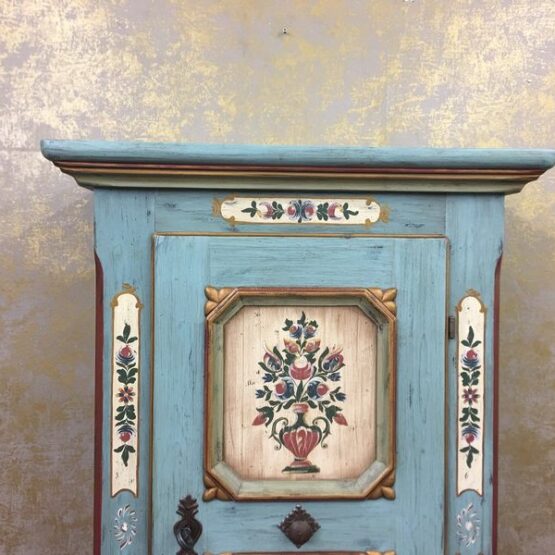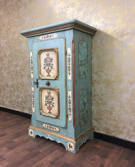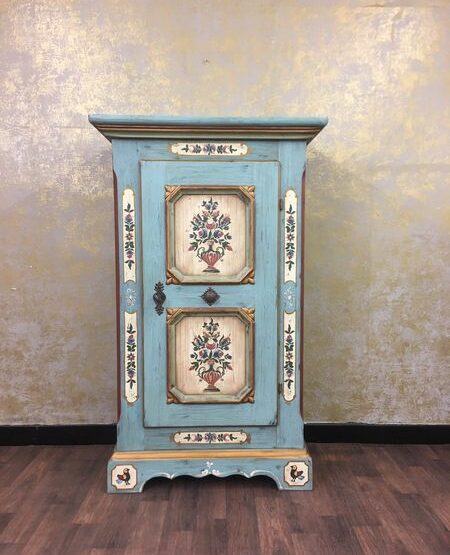 Ein echter Klassiker im Kleinformat: Dieser eintürige Bauernschrank von Voglauer besticht durch seine harmonische Gestaltung in Altblau mit liebevoll von Hand gemalten Blumenmotiven.