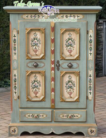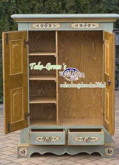 Ein Schrank wie aus einem alten Bauernhaus – und doch so praktisch wie heute: Dieser Voglauer Kleiderschrank in altblauer Fassung vereint traditionelle Malerei mit durchdachter Innenaufteilung.