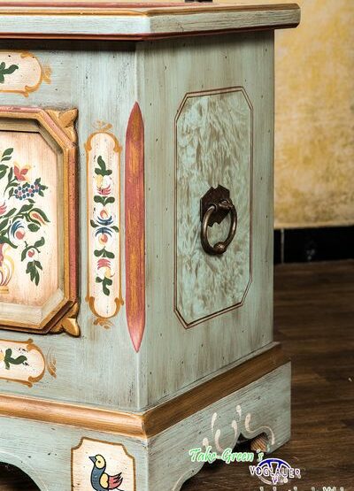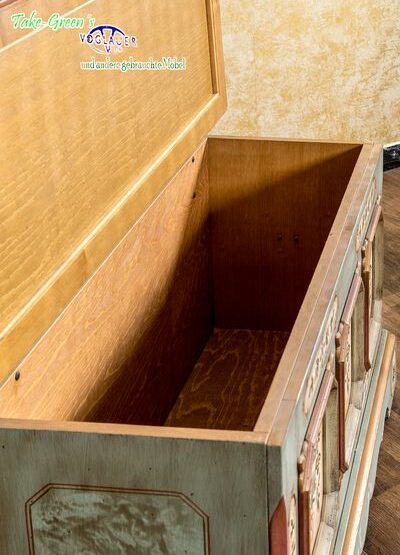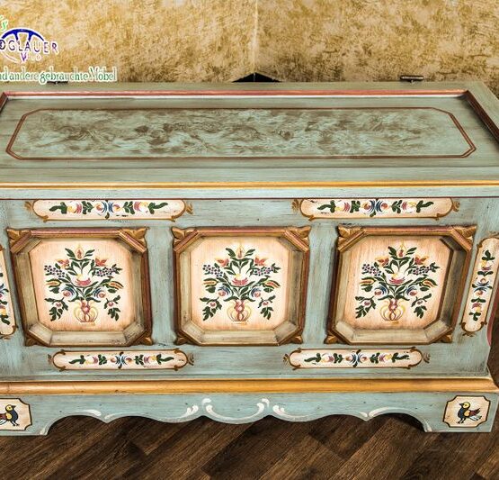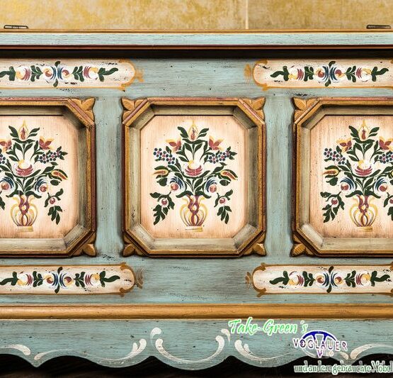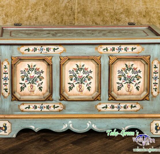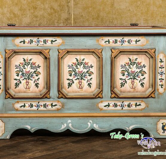 Mit dieser Truhe im originalen Voglauer-Stil zieht ein Stück gelebte Tradition in Ihr Zuhause ein. Die bemalten Kassetten auf der Front erzählen von floraler Handwerkskunst und verleihen dem Möbelstück eine warme, einladende Ausstrahlung.