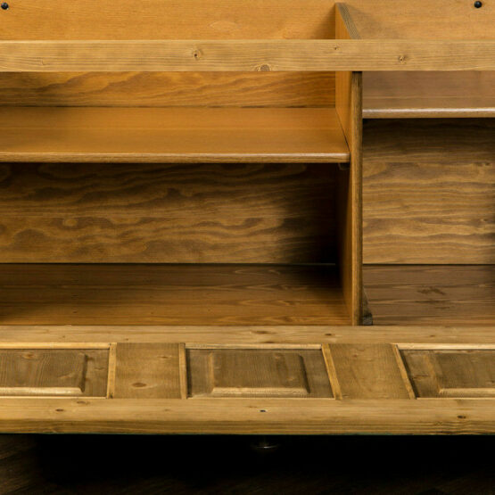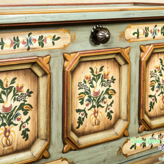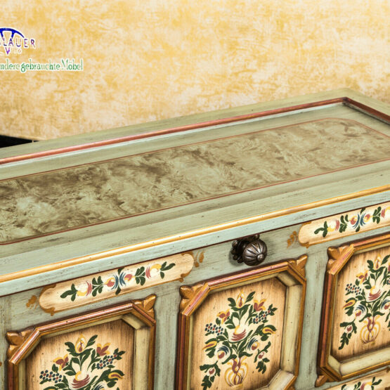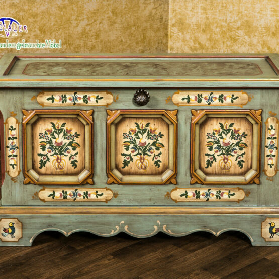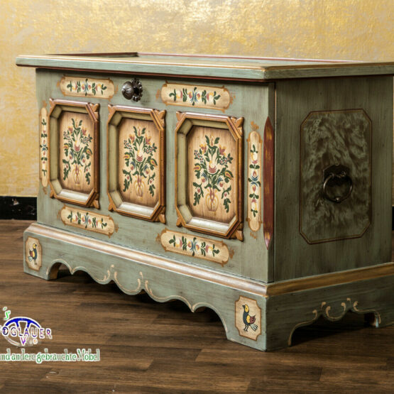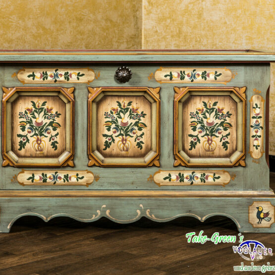 Diese handbemalte Truhe aus der Serie „Anno 1700“ verbindet ländlichen Charme mit praktischer Funktionalität. Die kunstvollen Malereien auf der Front, eingefasst in plastisch gearbeitete Rahmen, machen sie zu einem echten Schmuckstück.