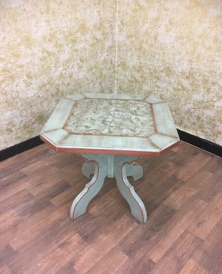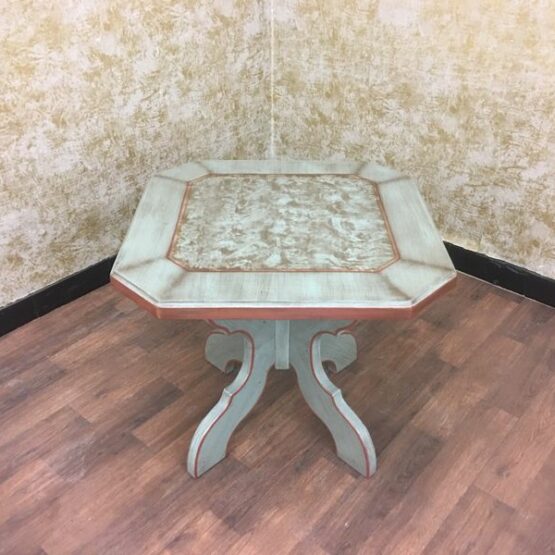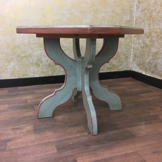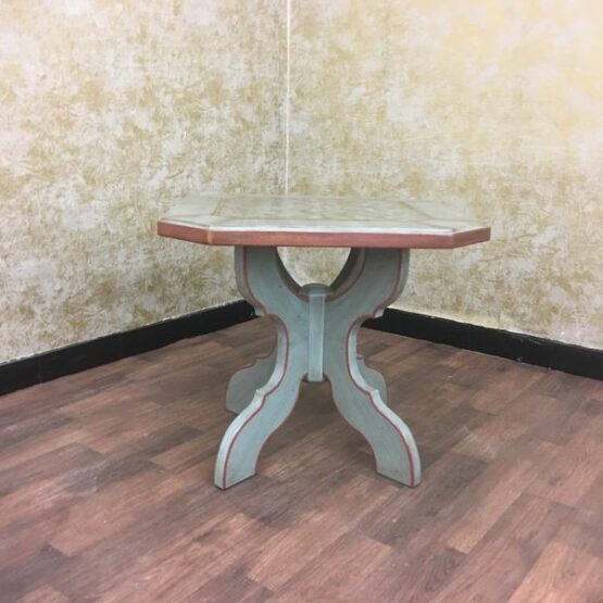 Die altblaue Fassung mit roter Kontur hebt die geschwungene Linienführung des Fußgestells gekonnt hervor. Die massive Tischplatte in warmem Holzton bietet Platz für Lampen, Bücher oder eine Tasse Kaffee – genau dort, wo Gemütlichkeit gefragt ist.