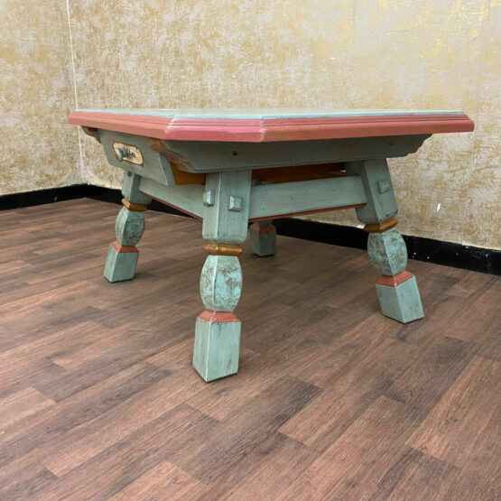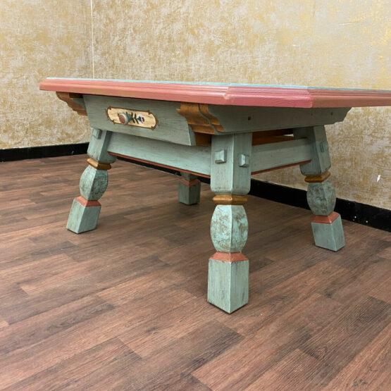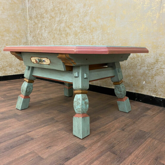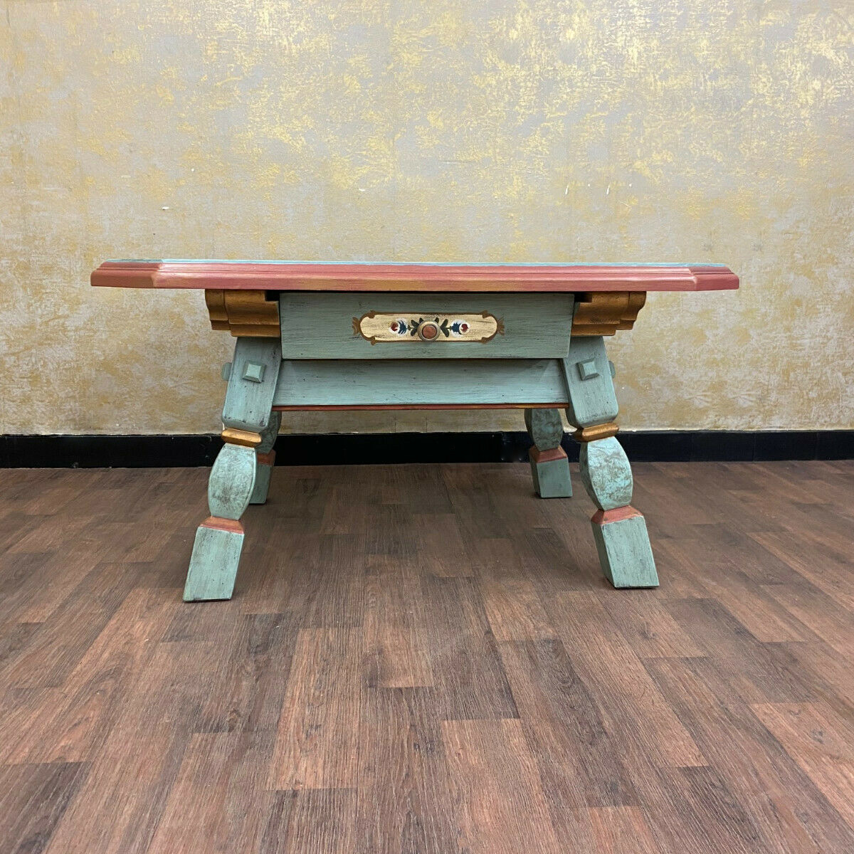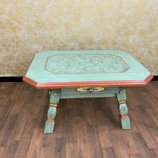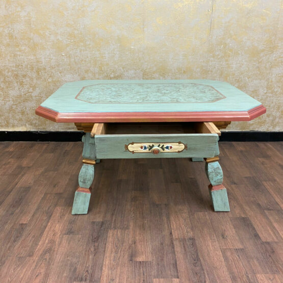 Mit diesem Couchtisch der Serie „Anno 1700“ von Voglauer, zieht ein Stück alpenländische Wohnkultur ins Zuhause ein. Die markanten Beine im typischen Voglauer-Stil, kombiniert mit der von Hand bemalten Zierleiste in Altblau, verleihen dem Tisch eine kraftvolle Ausstrahlung.