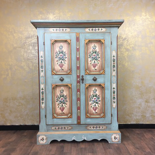 Ein Hauch vergangener Zeiten zieht mit diesem original Voglauer Kleiderschrank in Ihr Zuhause ein. Die klassische Formgebung der Serie „Anno 1700“ und die zartblaue Patinierung verströmen ländliche Gelassenheit, während die handgemalten Blumenmotive auf den Türfüllungen wie kleine Kunstwerke wirken.