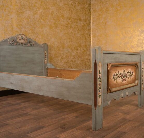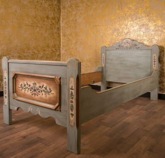 Das Einzelbett aus der Serie “Anno 1700” von “Voglauer” überzeugt in einem eleganten Altblau und mit filigranen Handverzierungen.