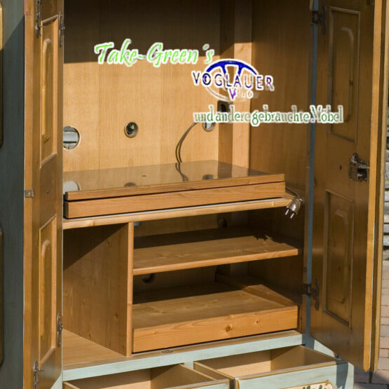 Gefertigt aus massivem Fichtenholz und liebevoll mit floralen Motiven verziert, bringt er Wärme und Charakter in Ihr Zuhause. Hinter den Türen verbirgt sich eine durchdachte Ausstattung: ein ausziehbarer Boden für den Fernseher, Kabeldurchführungen auf der Rückseite sowie zusätzliche Fächer und Schubladen für Zubehör.