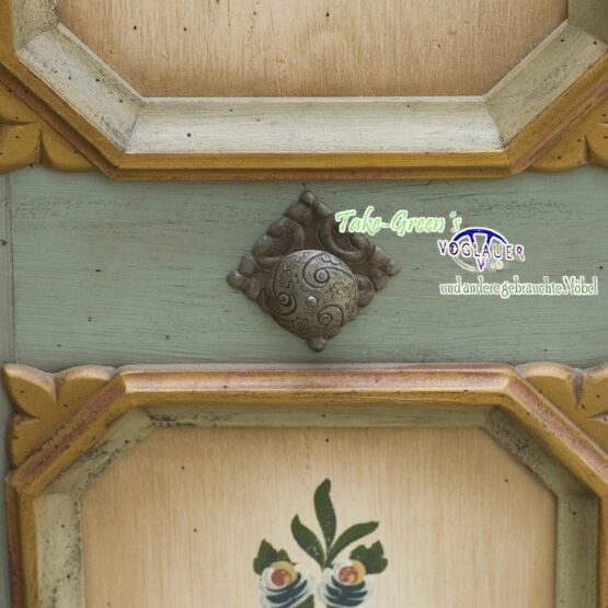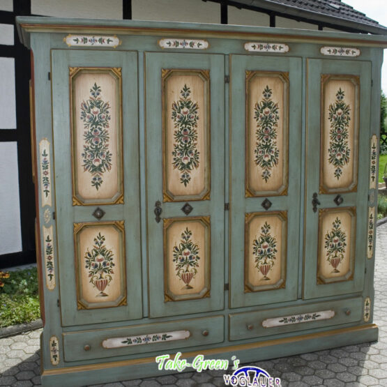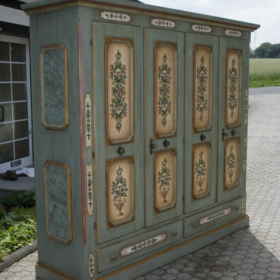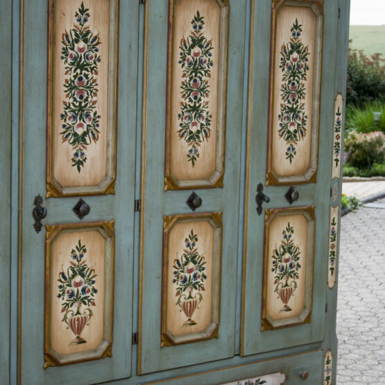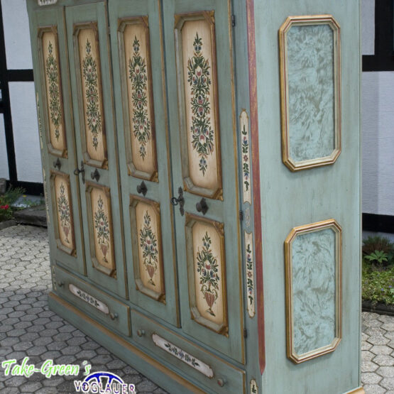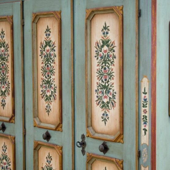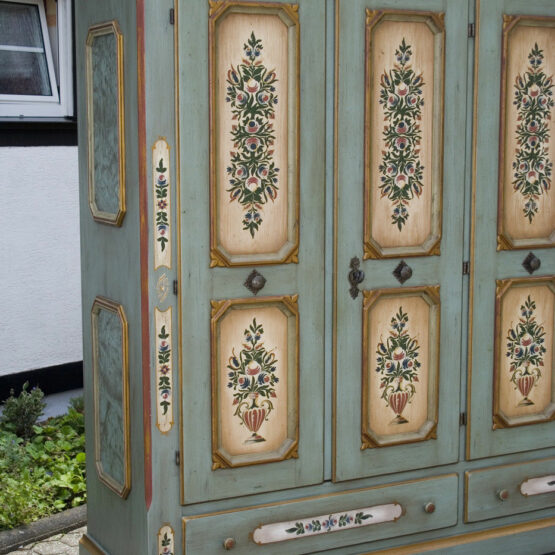 Die floral verzierten Türfüllungen erinnern an alpine Sommerwiesen, fein gerahmt von grün-goldenen Zierleisten, die dem Möbel seine charaktervolle Tiefe verleihen. Innen überzeugt er mit großzügigem Stauraum und praktischer Kleiderstange – perfekt für Tracht, Mäntel oder Wäsche.