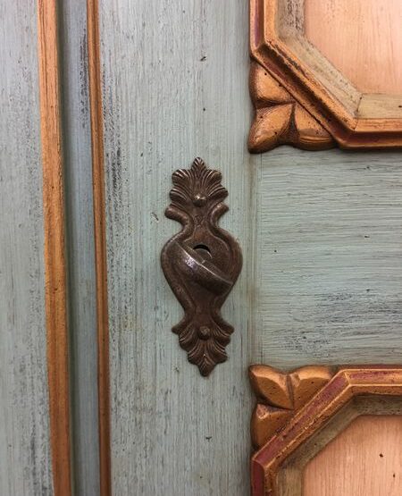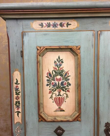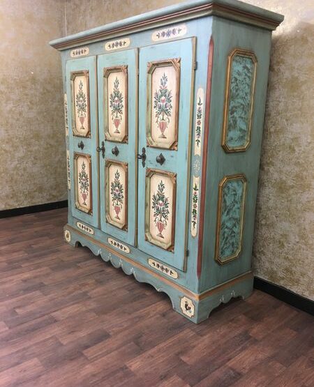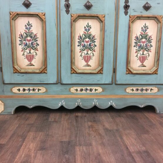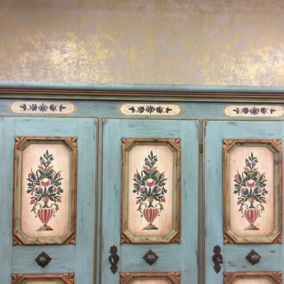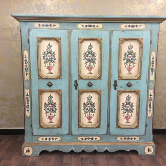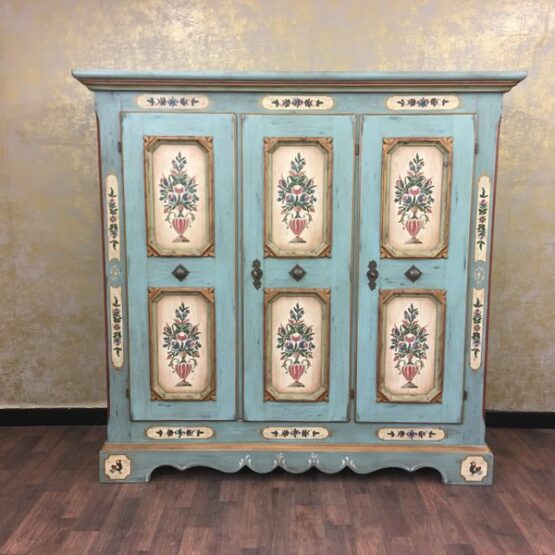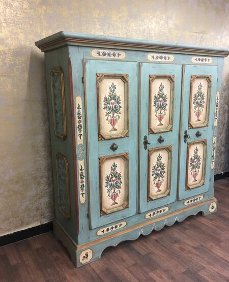 Ein Hauch von alpenländischer Heimat zieht mit diesem dreitürigen Voglauer Schrank in Ihr Zuhause ein. In traditioneller Handwerkskunst gefertigt und liebevoll restauriert, zeigt sich das Modell „Anno 1700“ in kräftigem Altblau mit den charakteristischen floralen Malereien auf elfenbeinfarbenem Fond – ein typisches Erkennungsmerkmal der echten Voglauer-Bauernmöbel.