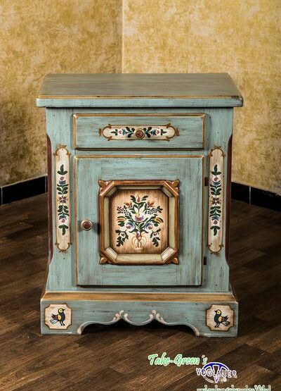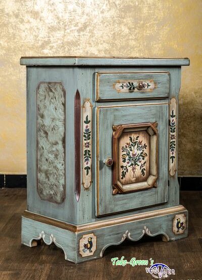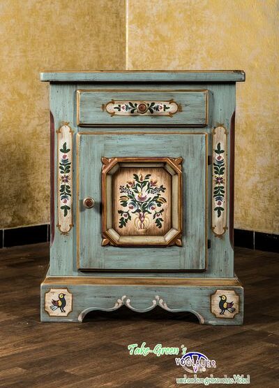 Die florale Malerei in zarten Tönen, eingerahmt von geschnitzten Zierleisten, verleiht dem Schränkchen seinen charakteristischen Bauernstil – lebendig, bodenständig und dennoch edel. Hinter der Tür mit Einlegeboden sowie in der oberen Schublade bietet das Schränkchen überraschend viel Stauraum für Alltagsdinge oder Geschätztes.