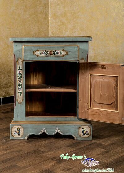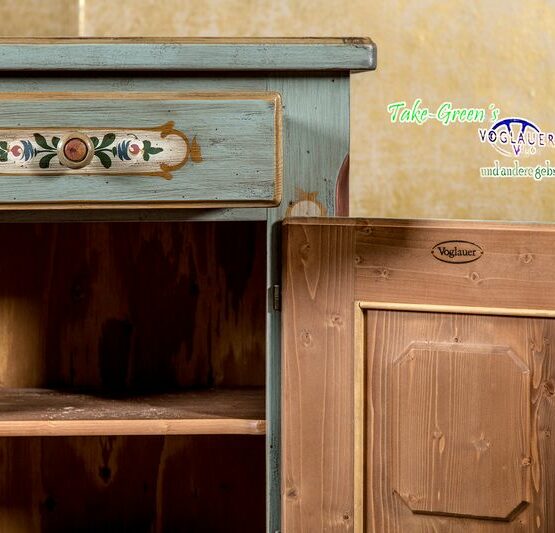 Diese eintürige Voglauer Kommode im typischen Altblau ist ein echtes Liebhaberstück für alle, die traditionelle Handwerkskunst schätzen.