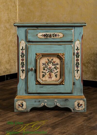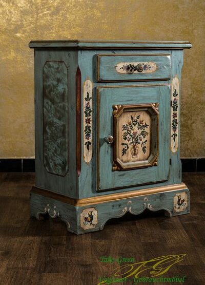 Diese bezaubernde Kommode aus der Serie „Anno 1700“ bringt mit ihrem altblauen Farbton und der liebevoll von Hand gearbeiteten Bauernmalerei einen Hauch Alpencharme in Ihr Zuhause.