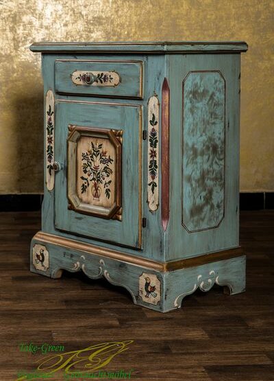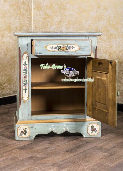 Eine Schublade und ein Fach hinter der Tür bieten Platz für persönliche Dinge, Bücher oder kleine Alltagshelfer. Ein Stück traditioneller Handwerkskunst, das Wärme und Charakter ausstrahlt.