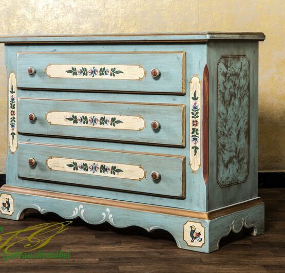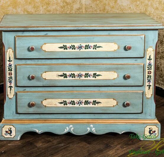 Die drei geräumigen Schubladen sind mit zarten, von Hand gemalten Blumenmotiven verziert, deren Farbtöne harmonisch mit der lasierten Oberfläche spielen. Die charmanten Vogelmotive am Sockel runden das Gesamtbild liebevoll ab.