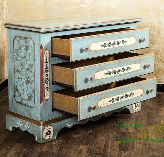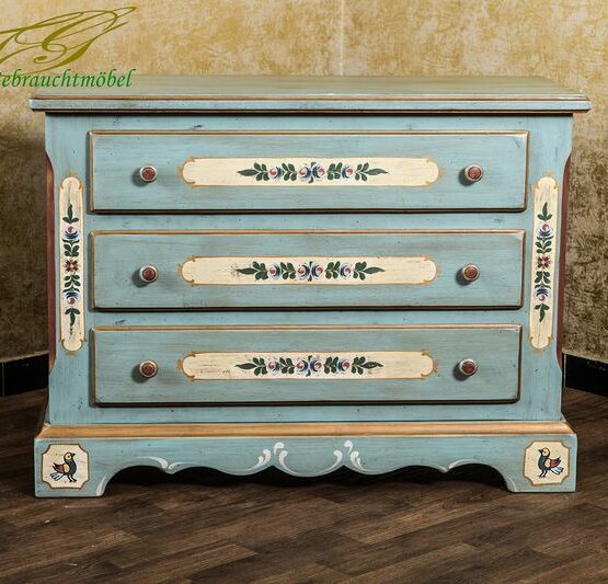 Ein Hauch von Bergluft, eingefangen in kräftigem Altblau: Diese original Voglauer Kommode aus der Serie „Anno 1700“ vereint traditionelle Handwerkskunst mit floraler Eleganz.