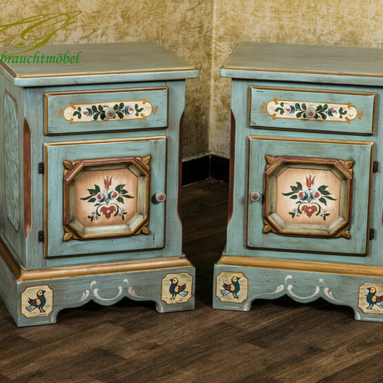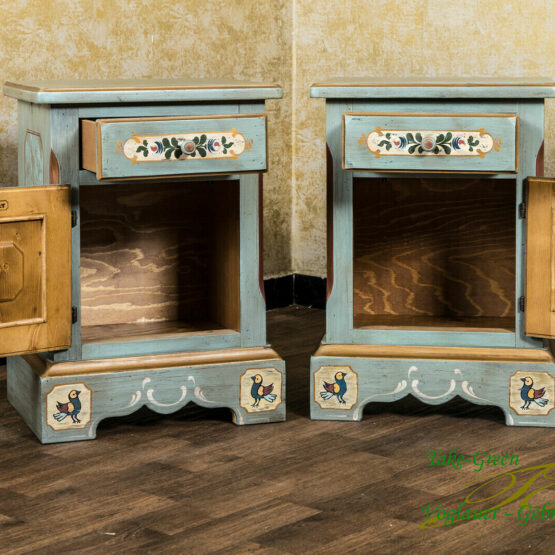 In warmem Altblau gehalten und mit floralen Motiven sowie kleinen Vögelchen handbemalt, strahlt er pure Gemütlichkeit aus. Die kleine Schublade mit gedrechseltem Holzknopf eignet sich ideal für Lesebrille, Notizblock oder Taschentücher, während der geräumige Innenraum hinter der Tür Platz für Bücher oder andere persönliche Dinge bietet.