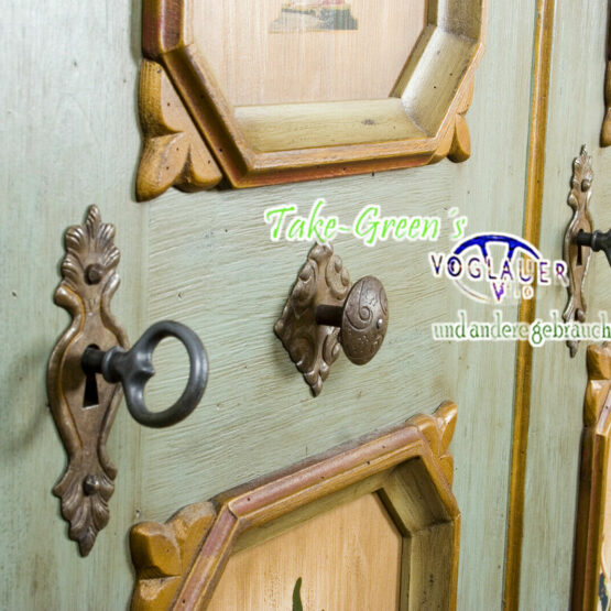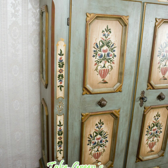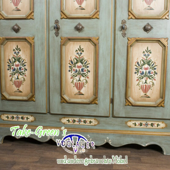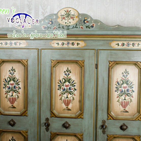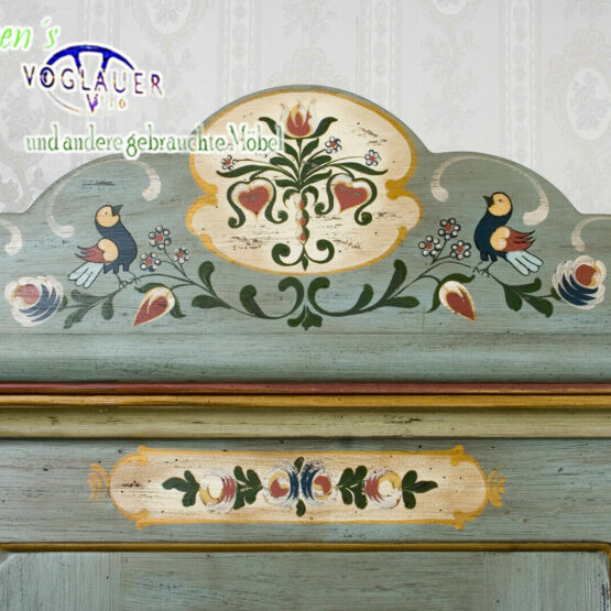 Mit diesem prachtvollen Voglauer Kleiderschrank im Farbton Altblau zieht ein Hauch von Heimat ein. Die fein geschwungene Krone verleiht dem dreitürigen Möbelstück eine stattliche Eleganz, während die floralen Malereien in zarten Naturfarben von echter Handwerkskunst zeugen.