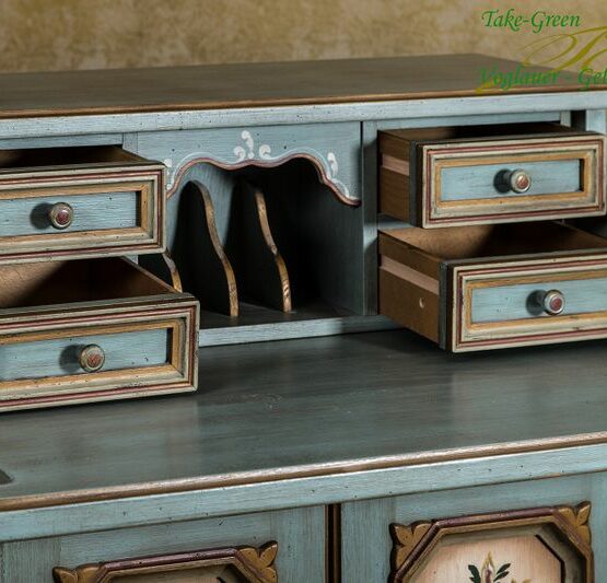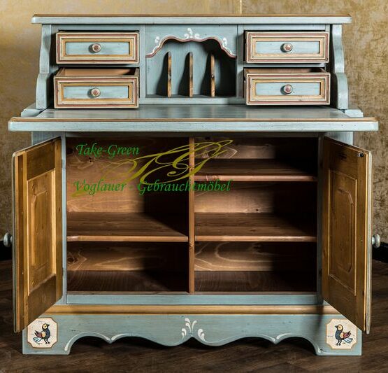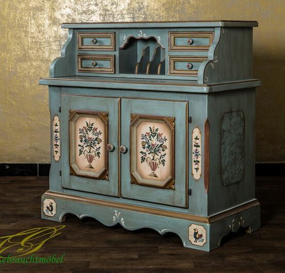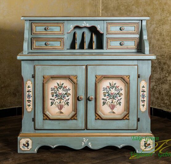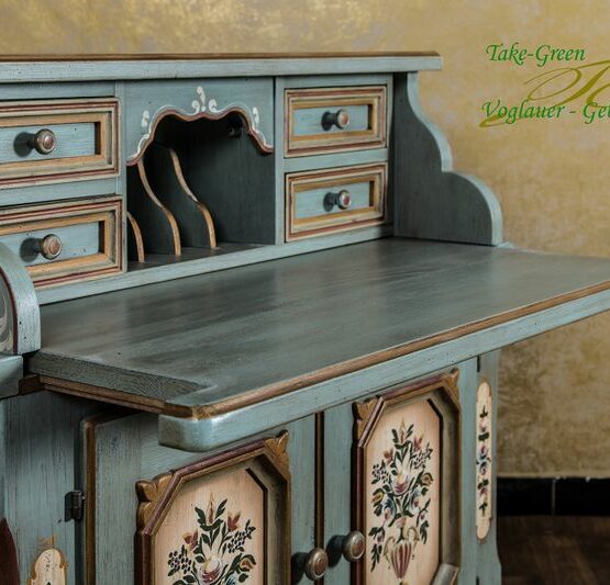 Mit seinem nostalgischen Altblau-Finish und der detailreichen Bauernmalerei, ist dieser Voglauer Sekretär ein echtes Herzstück aus der Serie „Anno 1700“.