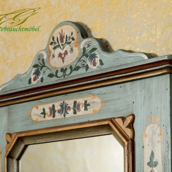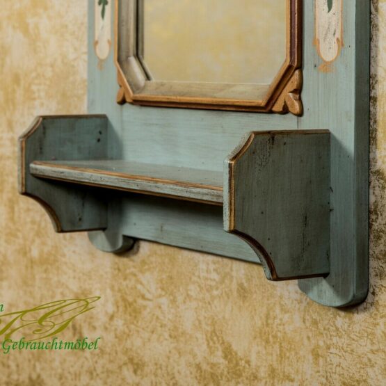 Das altblaue Holz, veredelt mit zarten, floralen Handmalereien, rahmt das Spiegelglas in kunstvoller Weise ein. Oben rund geschwungen, unten mit kleiner Ablage versehen – ideal für Schlüssel, Brillen oder kleine Alltagshelfer.
