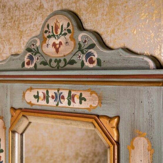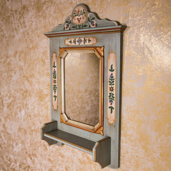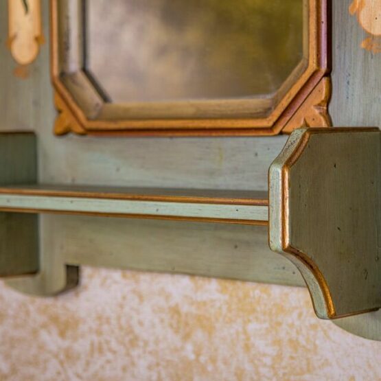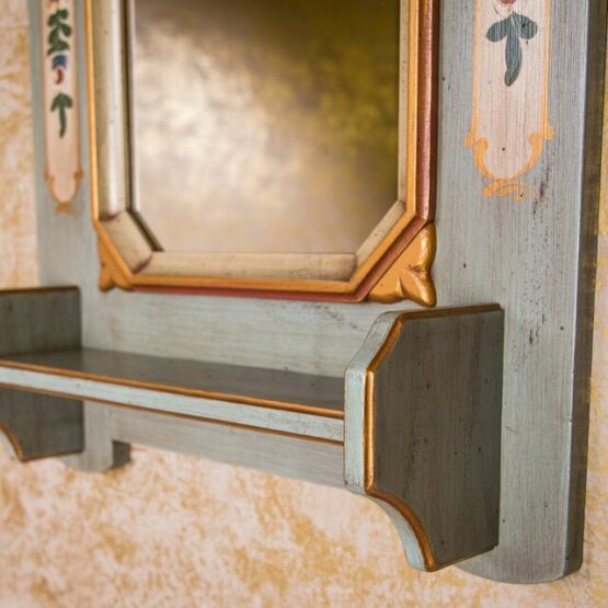 Die zart geschwungene Bekrönung, florale Malerei und goldene Akzente umrahmen das facettierte Spiegelglas in harmonischer Eleganz. Die kleine Ablage bietet Platz für Schlüssel, Parfum oder eine Kerze – praktisch und stilvoll zugleich.