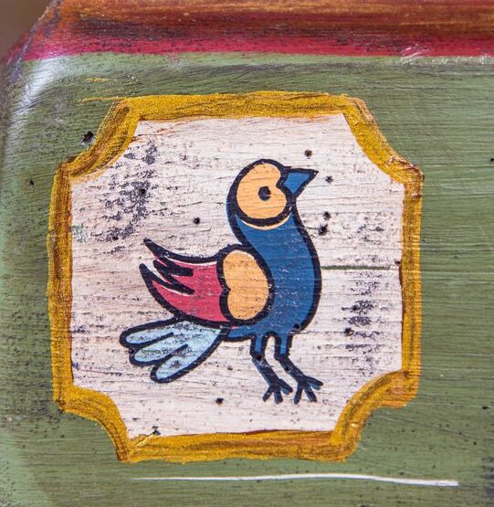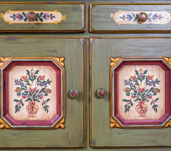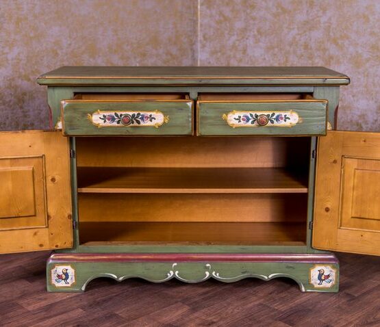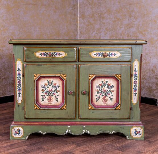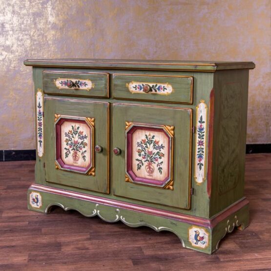 Die zweiflügelige Kommode wurde in traditioneller Handwerkskunst gefertigt und liebevoll von Hand bemalt: Blumendekore auf den Türfüllungen und Schubladen zaubern ländliche Lebensfreude ins Zuhause. Das Altgrün mit zarten Rot- und Ockertönen unterstreicht den charmanten, authentischen Charakter dieses Möbelstücks.