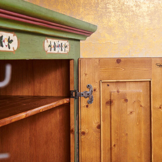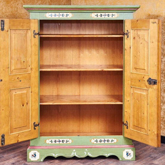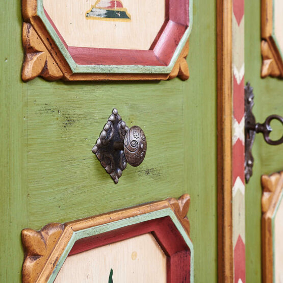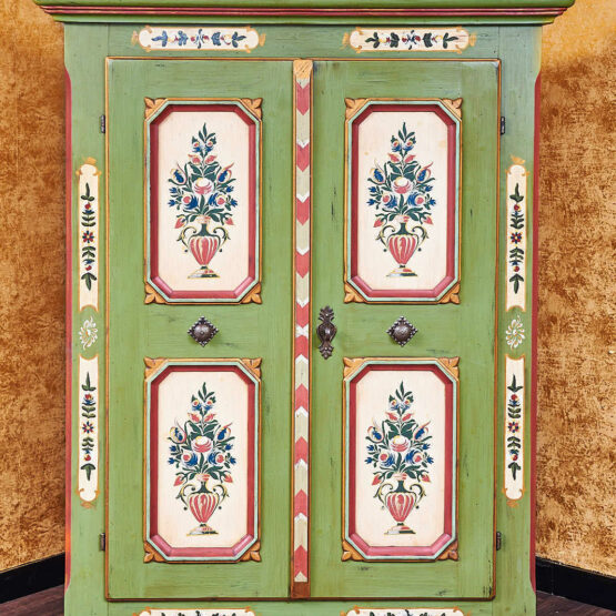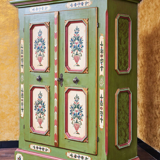 Wie aus einem Bilderbuch vergangener Tage: Dieser zweitürige Voglauer Bauernschrank in Altgrün verströmt das authentische Flair des Alpenlandes.