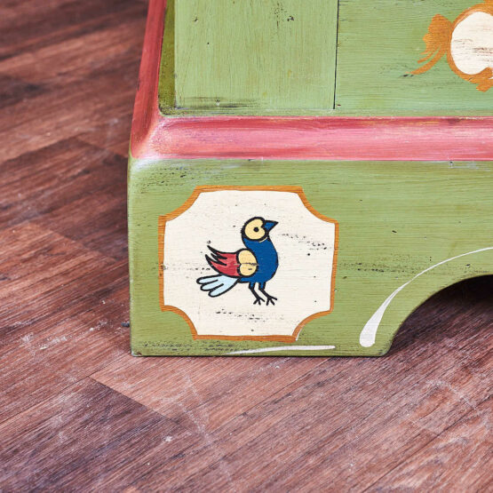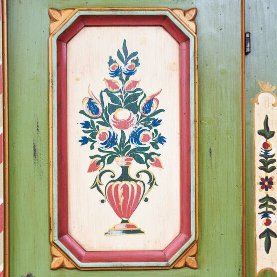 Handbemalte Blütenvasen auf altweißem Fond zieren die Türen und setzen kunstvolle Akzente – eingerahmt von liebevoll gestalteten Zierleisten in zartem Altrosa. Die sanft geschwungenen Sockel und die seitlichen Vogelmotive erzählen von ländlicher Lebensfreude und Handwerkskunst.