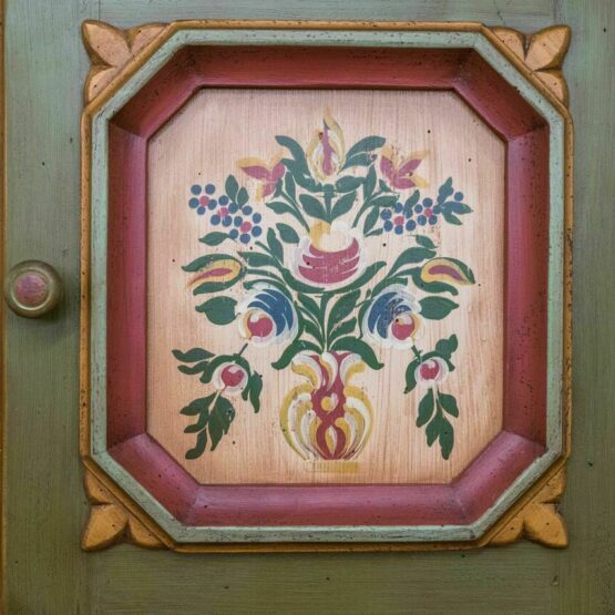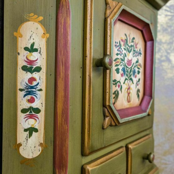 In sanftem Altgrün gehalten, entfalten sich auf den Fronten feinste Blumenmotive in warmen Farben – jede Fläche ein Unikat. Oben wie unten bietet der Schrank geschlossenen Stauraum, ergänzt durch praktische Schubladen und ein charmantes offenes Zwischenfach – ideal für dekorative Kleinigkeiten oder den Alltagsgebrauch.
