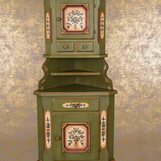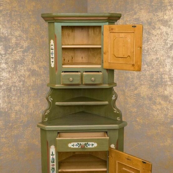 Ein wahres Schmuckstück für die Ecke: Dieser originale Voglauer Eckschrank aus der Serie „Anno 1700“ verbindet meisterliche Handwerkskunst mit liebevoller Malerei.