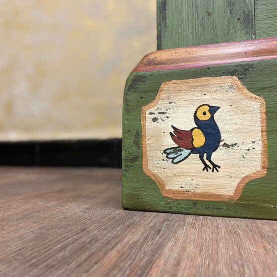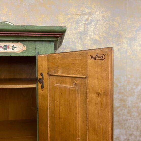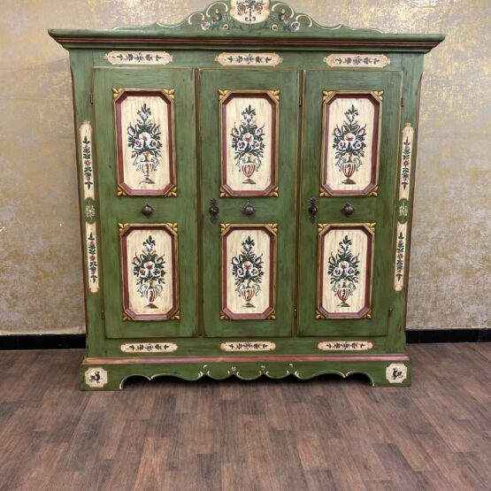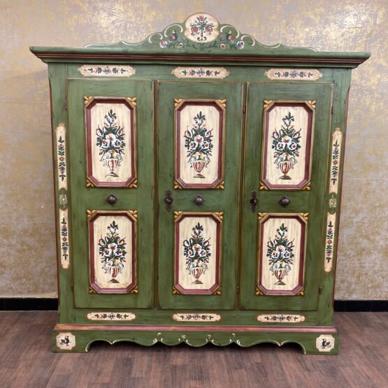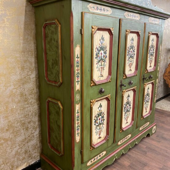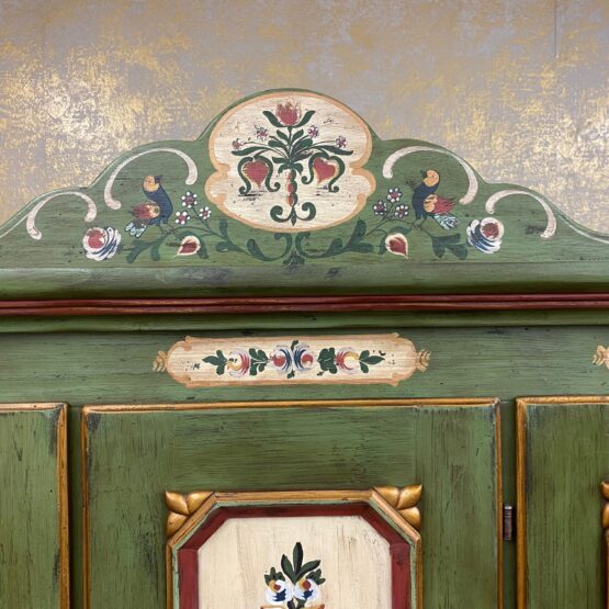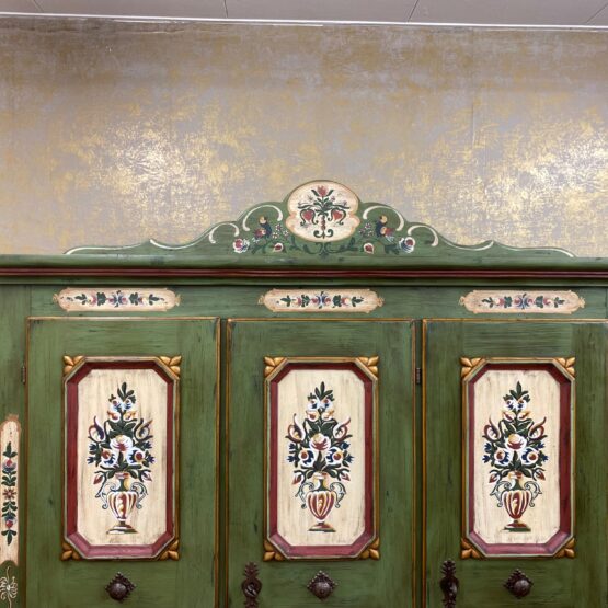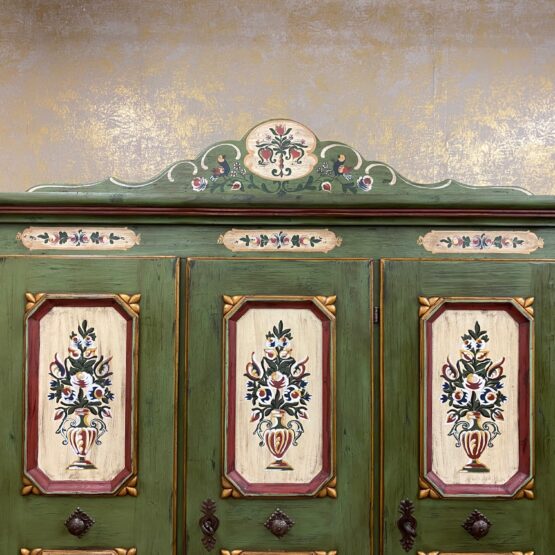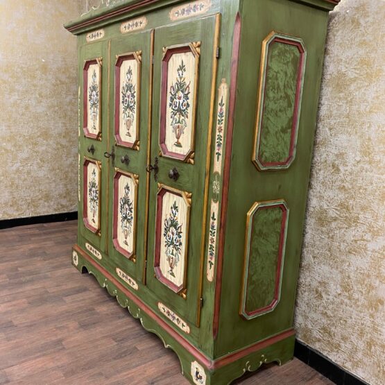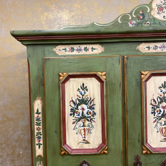 Ein Schrank wie ein Kunstwerk: Dieser originale Voglauer-Kleiderschrank in traditionellem Tannengrün beeindruckt mit reicher, floraler Handmalerei auf altweißen Feldern.