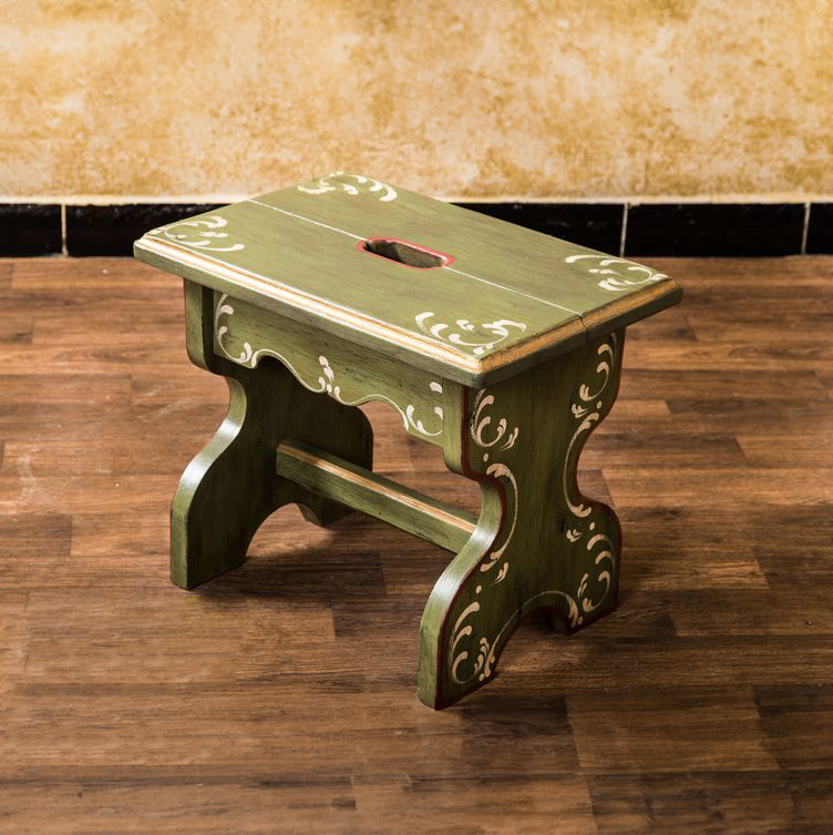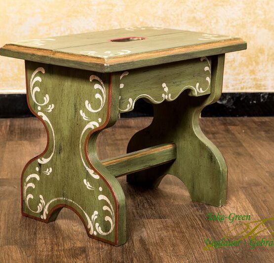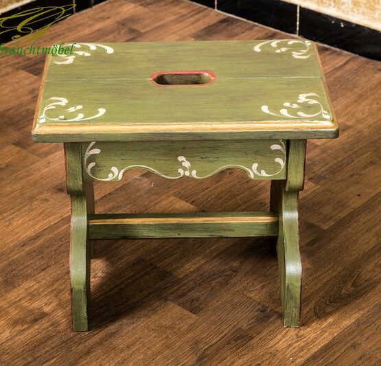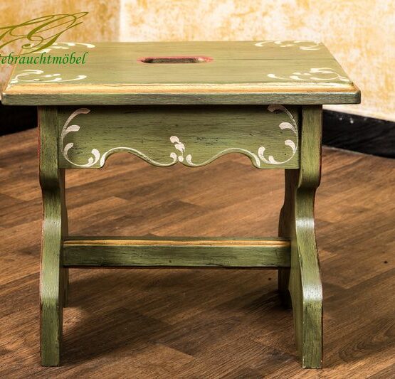 Sein warmer Altgrünton, die zarten Blumenornamente und das geschwungene Fußdesign erinnern an Stuben vergangener Tage. Gefertigt aus massivem Holz, dient er als Sitzgelegenheit, Blumenbank oder Tritthilfe – und ist dabei stets ein Blickfang.
