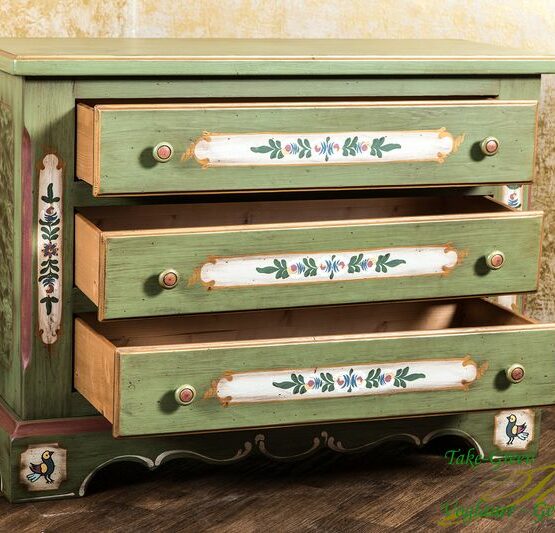Ihre drei Schubladen bieten großzügigen Stauraum – ideal für Wäsche, Alltagsutensilien oder liebgewonnene Andenken. Der sanft gewischte Grünton wirkt beruhigend und natürlich, während die floralen Malereien auf den Fronten und Seiten zart von vergangenen Zeiten erzählen.