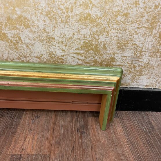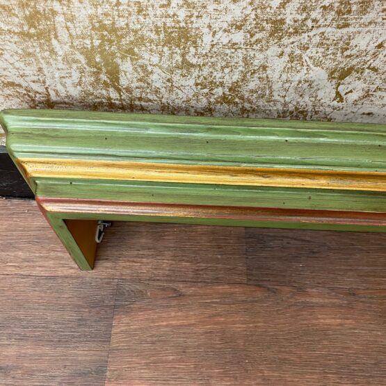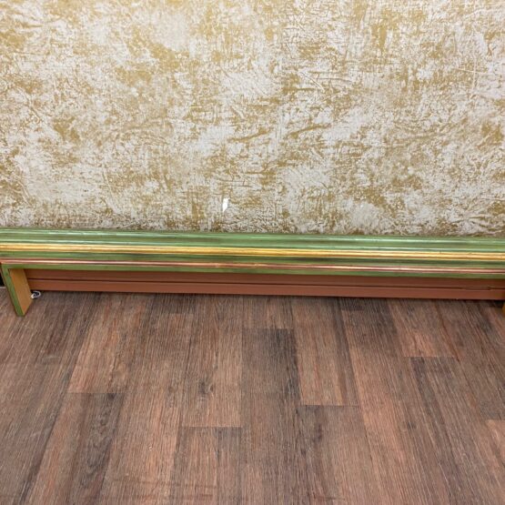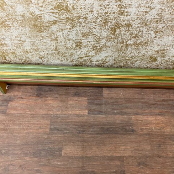 Das Holz ist in einem warmen Grünton mit goldfarbenen Akzenten gefasst und von Hand patiniert, wodurch eine lebendige, leicht antike Anmutung entsteht. Die Konstruktion ist stabil und für gängige Gardinen- und Vorhangsysteme geeignet, sodass sie sich sowohl für leichte Stores als auch für blickdichte Vorhänge anbietet.