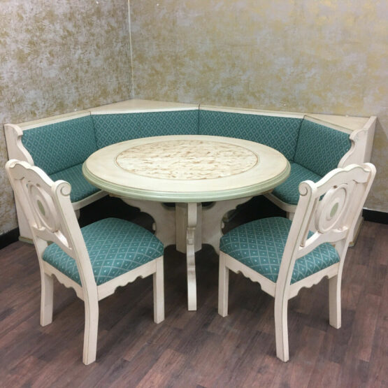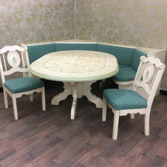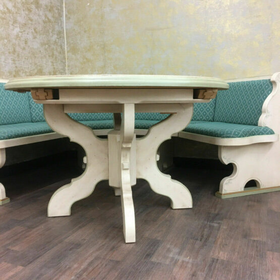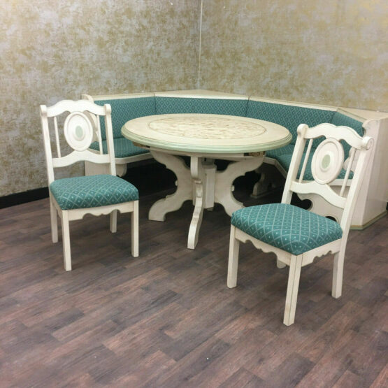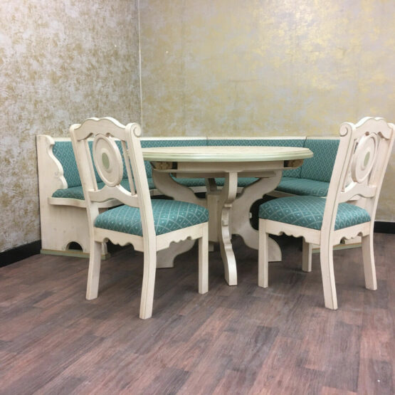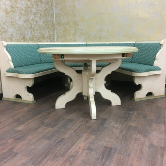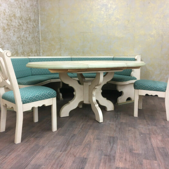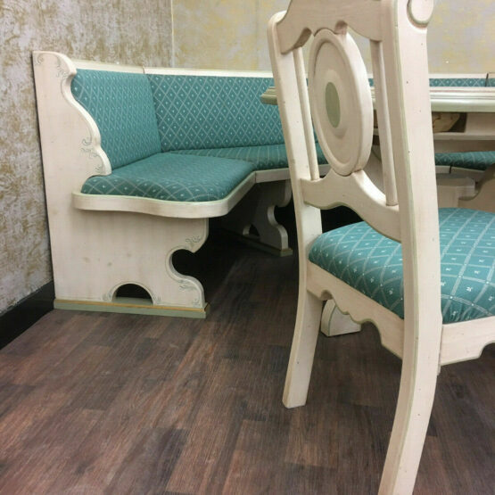 Es handelt sich bei dieser äußerst gemütlichen Essecke im Landhausstil, die aus Eckbank, Tisch und zwei Bauernstühlen besteht, um sehr exquisite Stücke von höchster Qualität.